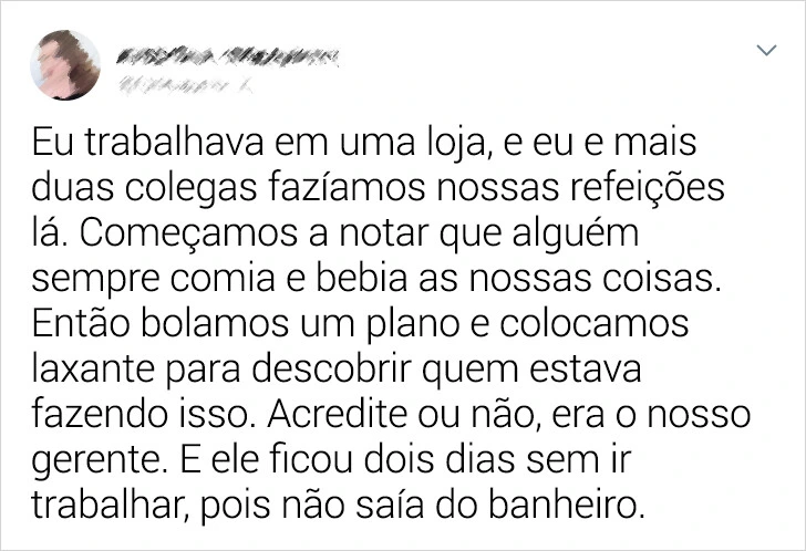 “Alguém sempre roubava meus doces no trabalho. Um dia, injetei laxante em duas trufas e deixei na gaveta. Dias depois, o ‘culpado’ passou muito mal e nunca mais tocou nos meus doces!”