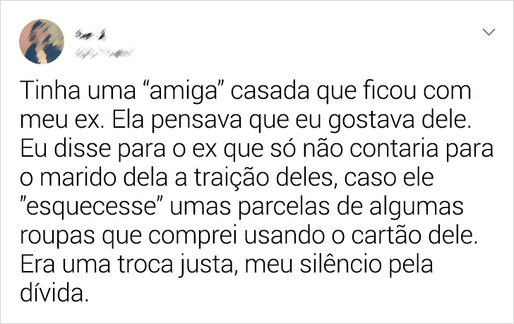 “Namorei um cara e descobri que ele tinha outra. Ele implorou pelo meu perdão, e eu disse que só aceitaria se ele terminasse com ela no viva-voz. Ele obedeceu. Assim que desligou, eu disse que não queria mais nada com ele. O livramento foi duplo!”