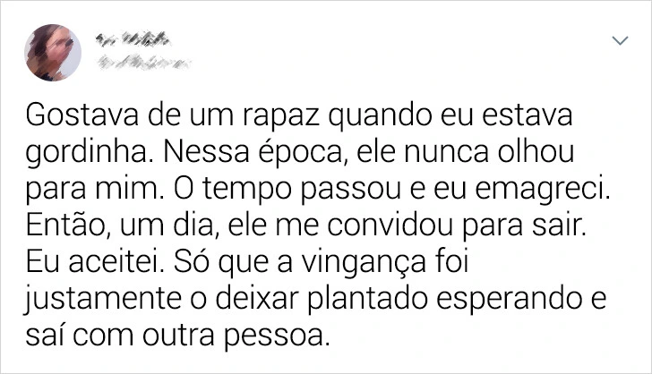“Uma prima minha me fez algo que até hoje não lembro, mas sei que mereceu. Pedi para uma amiga ligar e fingir que era de uma empresa contratando para uma vaga. Minha prima atravessou a cidade inteira para a suposta entrevista. Quando chegou lá e percebeu que não existia, voltou frustrada.”